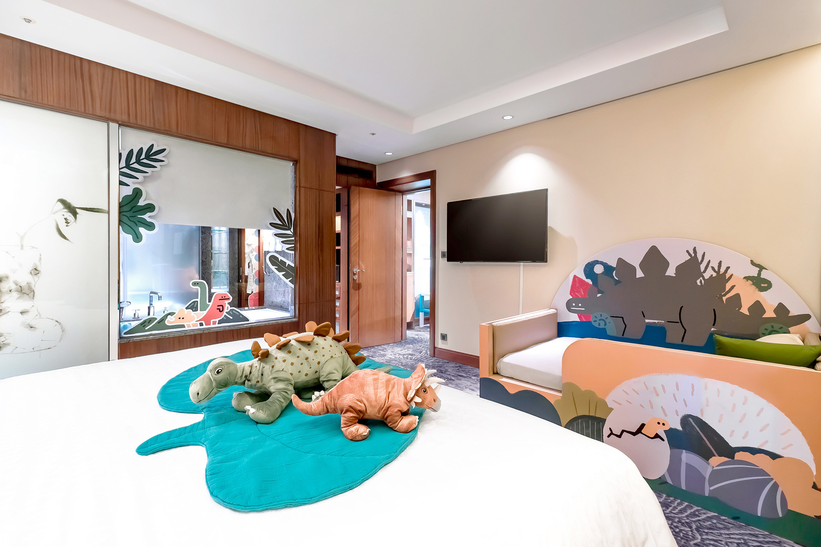 超人氣「親子主題房」擁有四大主題:動物森林、叢林小鎮、史前探險、恐龍王國的場景客房,房間內設有溜滑梯、專屬遊戲區、免費電影和卡通片等,絕對必搶擁有大型恐龍溜滑梯與盪鞦韆的親子主題套房,可愛夢幻的角色陪你入睡。