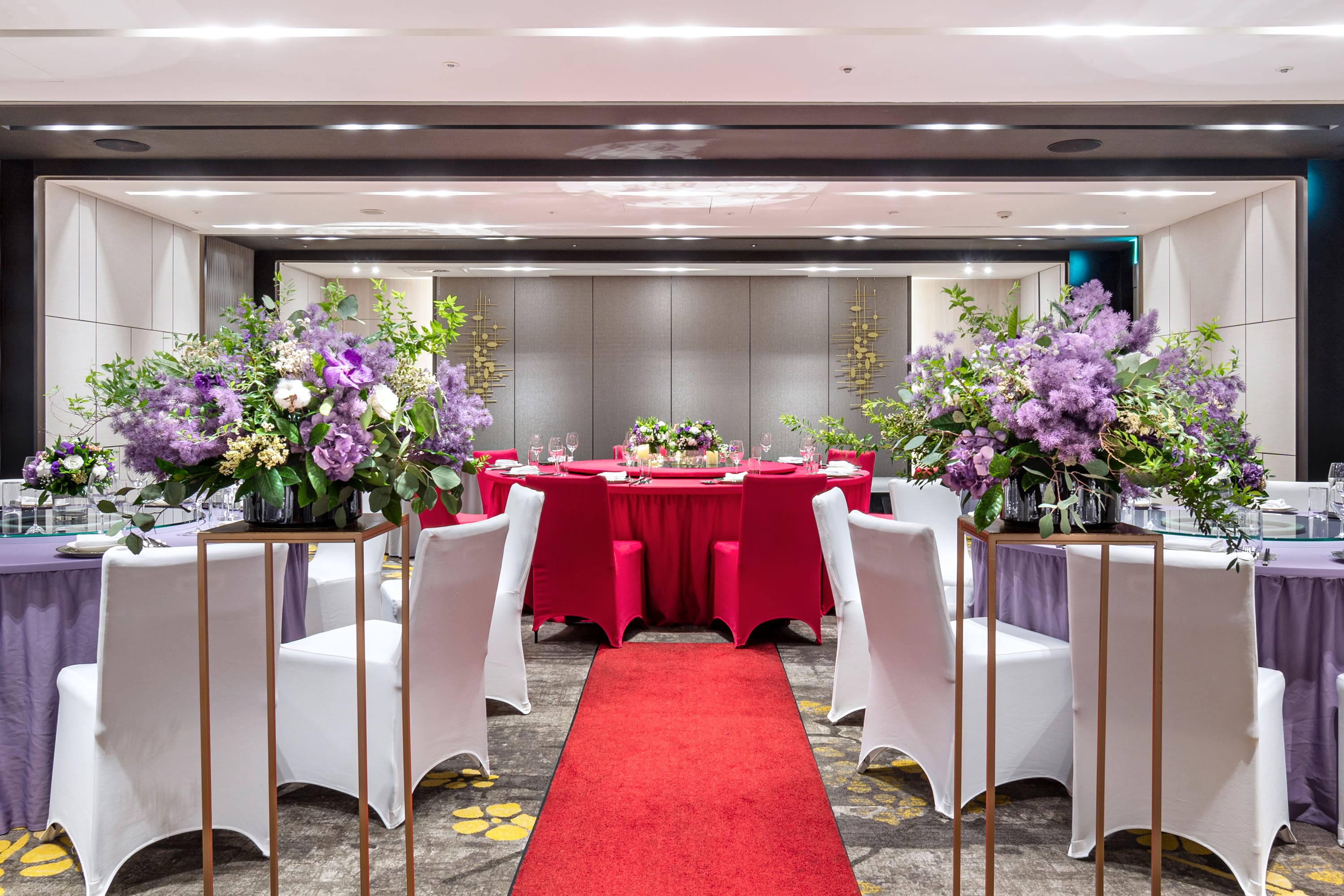 為全館最壯麗的婚宴殿堂,挑高4.8米氣派格局,鋪設英國手工地毯,以珊瑚紫與蓮花圖騰營造高貴氛圍。國際藝術家打造的琉璃吊燈映襯整體華美,310吋LED螢幕完整呈現婚禮每一刻,搭配升級宴席與設施,彰顯非凡氣勢。