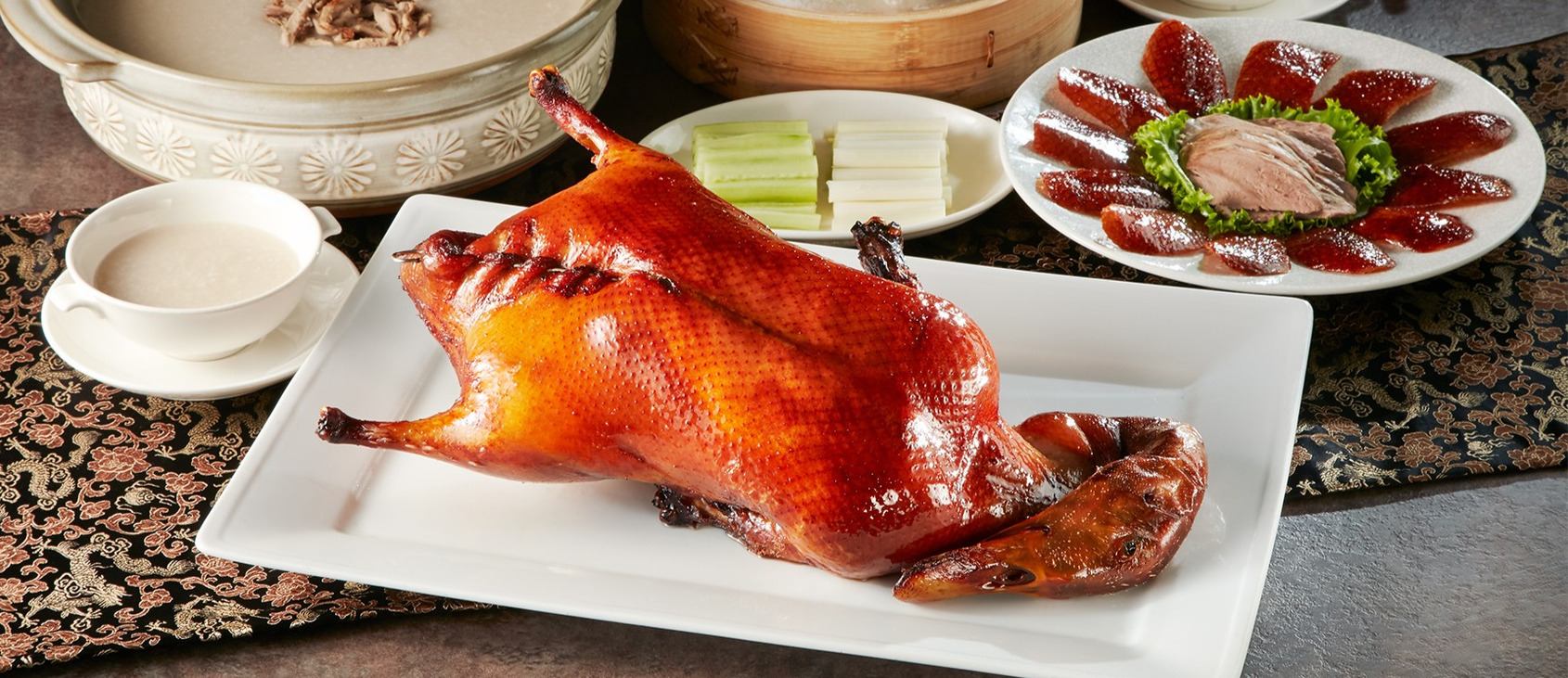 由素有「鴨王」的燒臘行政主廚楊華廣,師承香港知名燒臘老店鏞記的絕妙菜色,特選宜蘭北平鴨以十餘種中藥材及辛香料醃製入味,在外皮反覆淋上由麥芽糖及醋調制的鴨水後風乾,精準火侯烘烤至皮脆肉滑、香嫩帶汁。