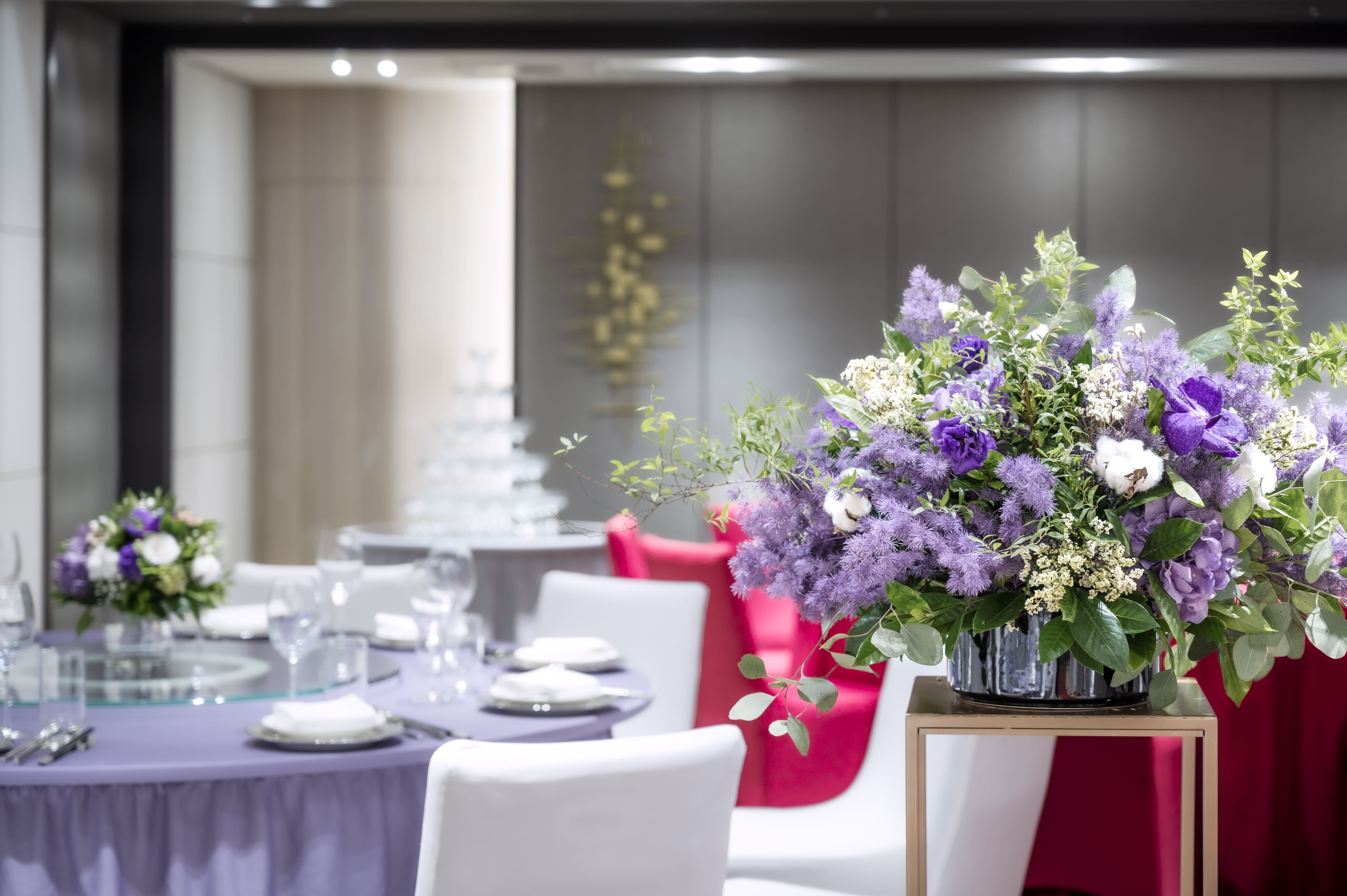 空間方正寬敞,鋪設英國Brintons珊瑚紫手工地毯,搭配蓮花圖騰,柔和雅致。場外設有獨立洗手間,並配備完善影音設備,無論舉辦精緻婚宴或中型聚會,皆可自在安排。