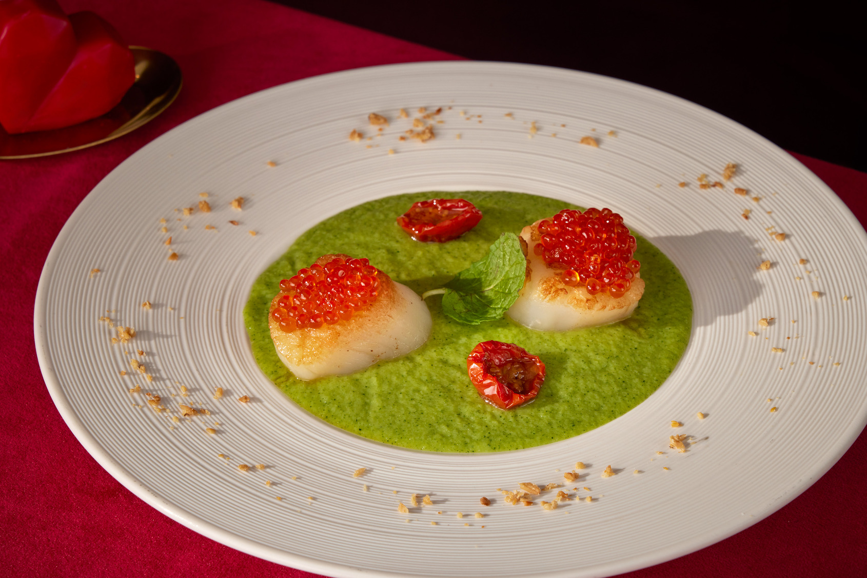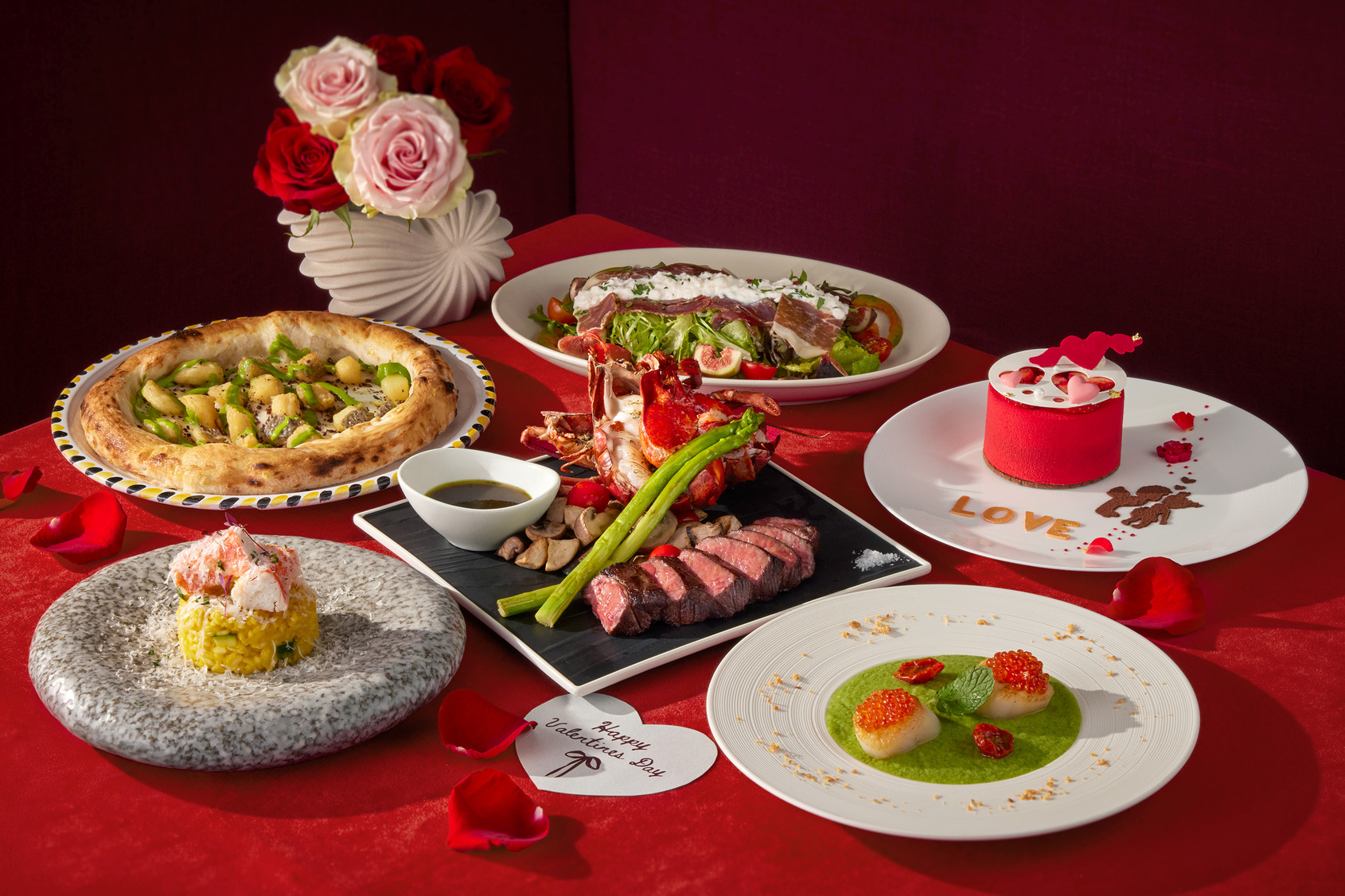 溫暖而富有義式風情的比薩屋,為西洋情人節精心打造六道式「義式浪漫饗宴」。以「金標伊比利火腿沙拉」揭開序幕,無花果、絲綢乳酪與義大利黑松露交織出鹹香與果甜的和諧層次;接續登場的「炭烤北海道干貝」,搭配薄荷櫛瓜鮮奶油與烤松子,口感細膩清新。